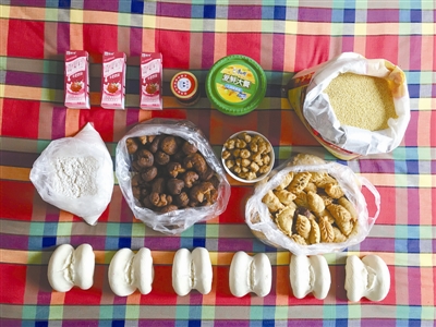 返程的行囊 辣椒油、方便面、小米、面粉、馒头、丸子、牛奶饮品、甜食。