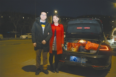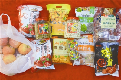 出发的行囊 北京果脯、干果、饮料、牛奶、小食品、大米、 食用油,以及买给爸妈的新衣服。本报记者 王伟伟 摄