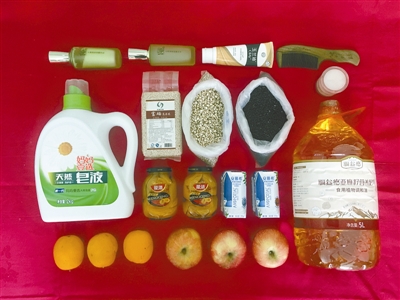 返程的行囊 化妆品、洗衣液、罐头、酸奶、水果、食用油、杂粮。