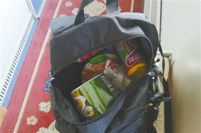出发的行囊 北京稻香村糕点、酒水、饮料、衣服,以及给弟弟买的课外读本和学习用品。本报记者 王伟伟 摄