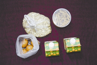 两杯果汁、四个鸡蛋、一小袋零食、一罐重庆小麻花。