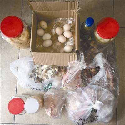 糖姜、一箱土鸡蛋、腌豇豆、腌萝卜、腊肠、咸肉、葛根粉、土鸡、咸鸭等。缪磊 摄