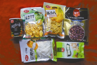 各种海南特产,如红椰肉、椰圆、炭烧咖啡、菠萝蜜干、香蕉片等,准备带给塔里木油田的同事品尝。
