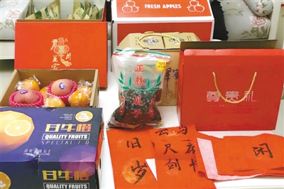 两箱水果,一箱蜂蜜和其它营养品,红包、春联等。