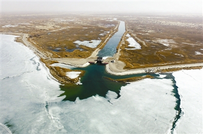 2月27日,承担输水调节任务的大西海子水库正在开闸放水(无人机拍摄)。