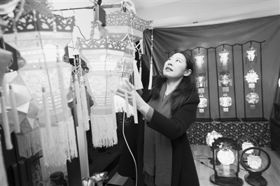 2月27日,省级非遗传承人陈彩平在悬挂刚做好的花灯。