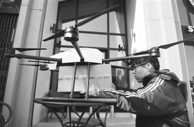 2月26日,杭州,工作人员正在将装箱的饮料固定在无人机上。