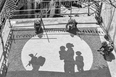 2月26日,江西上饶,农历正月十一,婺源篁岭晒秋大妈用辣椒、稻谷、黑豆三种农作物拼出一幅游子离乡图,表达游子对家乡不舍之情。