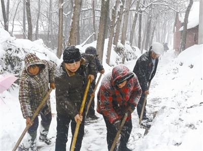 省总工会驻村扶贫工作队在村里和老乡一起清理被大雪覆盖的道路