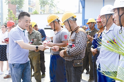 在安徽省总工会“尊法守法·携手筑梦”服务农民工法治宣传行动中,工作人员为农民工发放法治宣传品
