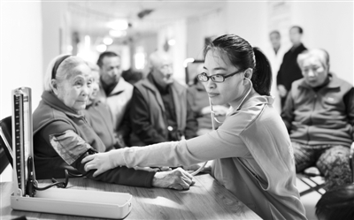 2月28日,爱心志愿者在安平县春晖园养老院为老人测量血压。