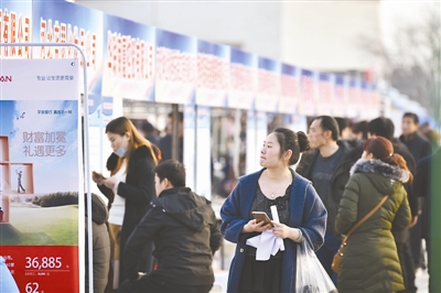 3月3日,求职者在招聘会现场寻找就业岗位。当日,河北省定州市2018年“春风行动”就业招聘洽谈会在定州开元寺塔广场举行,130家用人单位携3500个岗位进场招聘,吸引众多求职者前来应聘。