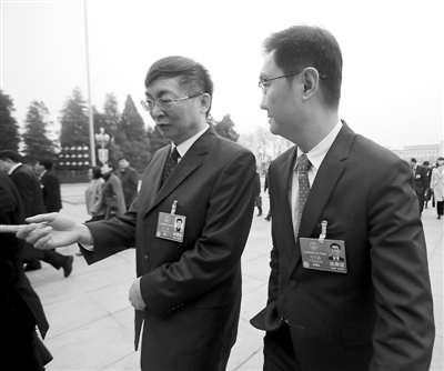 3月4日上午,十三届全国人大一次会议在北京人民大会堂举行预备会议。会议开始前,腾讯公司董事会主席马化腾(图右)代表和深圳市人大常委会主任丘海代表边走边交流。