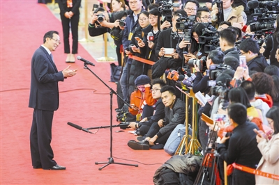 3月5日,农业部部长韩长赋在“部长通道”接受记者采访。