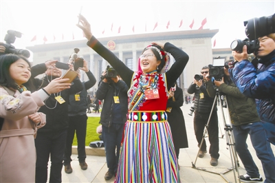3月3日下午,在北京人民大会堂东门外广场,来自云南省怒江傈僳族自治州的丁秀花委员用手机与千里之外的乡亲们视频连线。