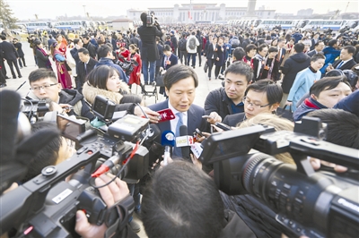 在今年两会上,小米创始人雷军代表建议成立国家级设计促进机构,优先发展工业设计。图为3月5日雷军代表在接受媒体采访。本报记者 王伟伟 摄