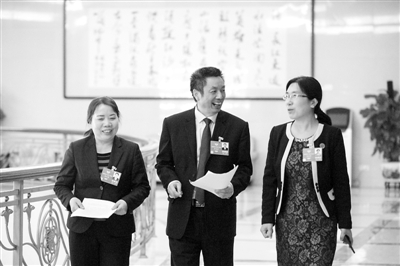 3月6日,来自工会界的钟正菊委员(左)、许启金委员(中)、张恒珍委员就各自的提案进行交流。三位委员均来自一线,在企业如何留住年轻人以及提高一线技术工人的荣誉感和获得感上产生共鸣。本报记者 王伟伟 摄