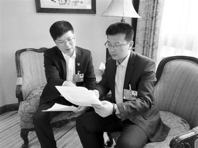 3月4日,胡中辉(左)代表和梁兵代表在讨论本次两会上即将提交的建议。受访者供图