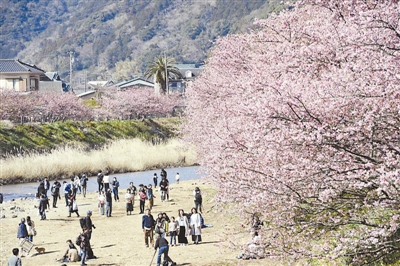 在太平洋沿岸的日本伊豆半岛,河津樱竞相绽放,吸引了众多游客。