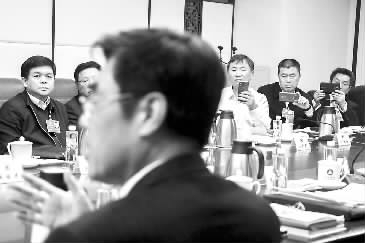 上图:3月9日,政协工会界别分组讨论会上,当国家电网公司董事长舒印彪委员谈起现代能源发展问题时,坐在对面的许启金委员(右一)、刘延云委员(右二)、孙承业委员(右三)拿起手机现场记录。本报记者 王伟伟 摄