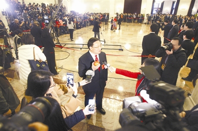 3月11日下午,“代表通道”第三次开启。云南昭通市委副书记、市长郭大进代表刚刚结束“代表通道”的采访,就被记者拦在通道出口继续采访。郭大进拿出一个从昭通带来的苹果,向记者讲述了昭通扶贫攻坚的故事。昭通把“交通先行”作为重要扶贫战略,助力当地苹果产业发展。红苹果变身“金苹果”,带动很多贫困群众脱贫致富。本报记者 杨登峰 摄