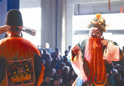 3月7日,在山东省邹平县焦桥镇后三村的农村剧场,三斋剧社的演员表演京剧《龙凤呈祥》。