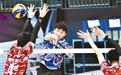 3月11日,在中国男排超级联赛半决赛第一回合比赛中,北京队主场以3比1战胜八一队。本报记者 许之丰 摄