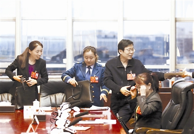 3月10日,在天津代表团小组讨论会后,4位一线职工代表郭红静、王艳、李刚、巩建丽(从左至右)接受了记者采访。他们结合工作实际讲述自己的奋斗故事,交流心得。本报记者 杨登峰 摄