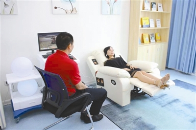 来访员工在催眠音乐椅上静心放松