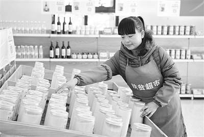 3月13日,店员王艳红在超市内整理货品,她是周至县南寨子村的贫困户。