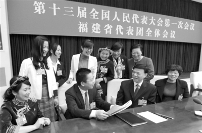 3月13日下午,在福建代表团全体会议结束后,代表们仍有许多话想表达,几位来自基层的职工代表和福建省人大常委会副主任、省总工会主席张广敏代表(前排左三)围坐在一起,就一线职工提升自身综合素质,投身新时代展示新作为,在新征程中建功立业继续展开讨论。