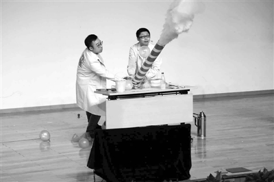 图为两位科技工作者在演示做实验的过程。王闻 摄