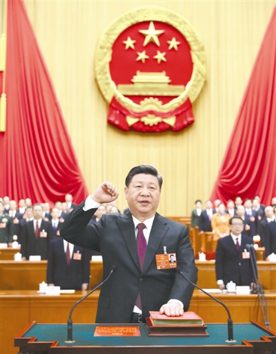 3月17日,十三届全国人大一次会议在北京人民大会堂举行第五次全体会议。习近平当选中华人民共和国主席、中华人民共和国中央军事委员会主席。这是习近平进行宪法宣誓。