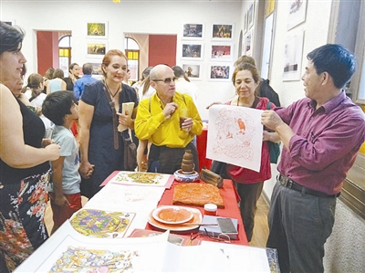 图③为2017年,任鹤林带开封木版年画走进南美。
