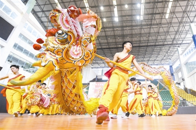 3月15日,重庆铜梁二中的学子挥舞着金龙腾空而起。当日,来自全国130余所大中小学代表齐聚该校,参加第六届全国舞龙舞狮进中小学工作研讨会。