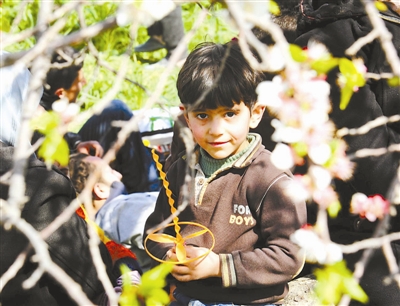 3月17日,在叙利亚大马士革东郊东古塔地区,一名男孩随家人撤离至临时安置点。