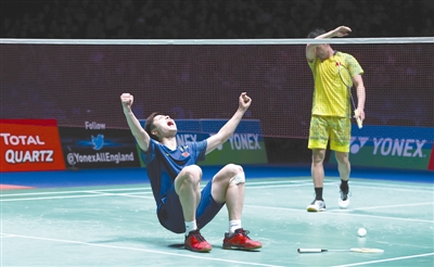 3月18日,在全英羽毛球公开赛男单决赛中,中国选手石宇奇以2比1战胜林丹,夺得冠军。石宇奇(左)在获胜后庆祝。新华社记者 韩岩 摄