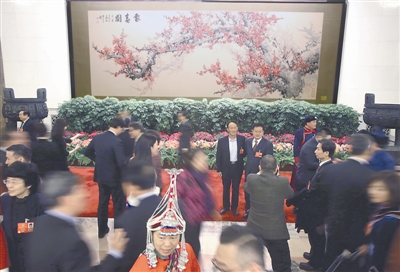 3月20日上午,参加第十三届全国人民代表大会第一次会议闭幕会的代表们在国画《报春图》前合影。