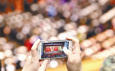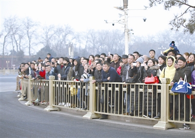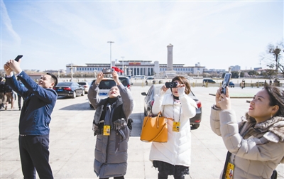 3月1日,采访两会的记者在北京人民大会堂东门外广场拍摄蓝天照。
