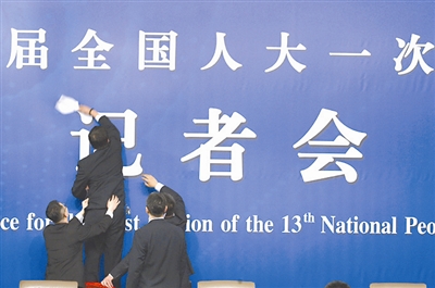 3月10日上午,两会新闻中心,在一场政协委员与记者见面会后,工作人员更换并清洁背景板,为半个小时后人大召开的另一场记者会布置会场。今年两会,共有14场记者会。
