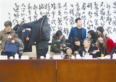3月12日,在经济界分组讨论会后,杨伟民委员再次被媒体“围堵”,邻座的王寿君委员起身与两位委员交流。