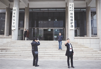 3月13日,环境保护部门前,工作人员拍照留念。当日,《国务院机构改革方案》提请十三届全国人大一次会议审议。方案提出,组建生态环境部,不再保留环境保护部。