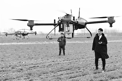 正值春季农业生产繁忙季,在山东省邹平县,植保无人机、植保机器人、大型指针式喷灌机等新农机装备投入到生产中,提高了生产效率。图为植保无人机在田地里作业。