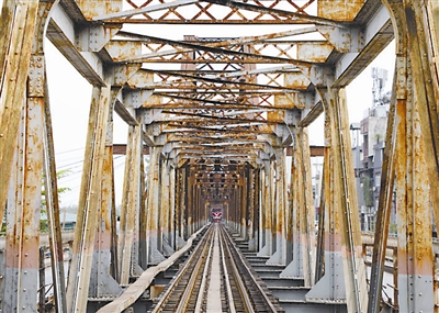 这是3月21日在越南首都河内拍摄的龙边桥。龙边桥是越南首都河内第一座横跨红河的铁桥,它由巴黎埃菲尔铁塔设计者古斯塔夫·埃菲尔设计,于1899年开始建造,1902年完工。龙边桥全长2290米,架在40米高的20座桥墩上,引道主要使用石头建成。龙边桥中间为火车道,两侧为摩托车和人行道。由于老化严重,龙边桥曾多次维修。