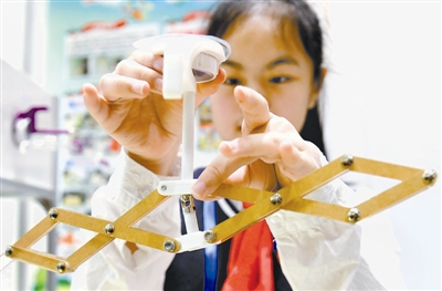 3月23日,在第33届广西青少年科技创新大赛上,柳州市景行小学学生在展示自己设计的便携式差旅衣架。当日,第33届广西青少年科技创新大赛在广西科技馆举行,14支代表队参赛。 新华社记者 张爱林 摄