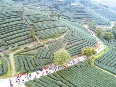 3月26日,团队游客在拔山村万亩茶山游览(无人机航拍)。