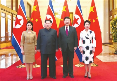 3月25日至28日,应中共中央总书记、国家主席习近平邀请,朝鲜劳动党委员长、国务委员会委员长金正恩对我国进行非正式访问。访问期间,习近平同金正恩举行会谈。这是习近平和夫人彭丽媛在人民大会堂同金正恩和夫人李雪主合影。新华社记者 鞠鹏 摄