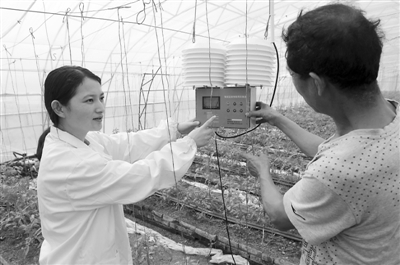 图为三河市农业局的技术人员(左)在指导种植户使用智能温室物联网采集器,收集大棚内的温度和湿度等相关信息。