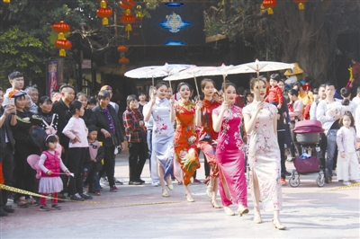 3月28日,广东佛山,许多女子穿着旗袍来参加丽人节。今年3月至4月中旬,广东佛山长鹿旅游休博园举办主题为“长鹿旗袍丽人节·月韵水乡女人花”的第六届女人节活动,活动内容包括浪漫岭南油纸伞文化节,与花共舞·水乡花海季,品花茶·听怀旧曲,怀旧经典旗袍秀等。