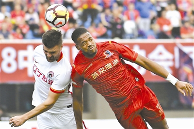 4月1日下午,北京奥体中心体育场。中国足球甲级联赛第四轮比赛中,北京北控燕京主场以0比1负于辽宁沈阳宏运。图为双方队员在比赛中拼抢头球。